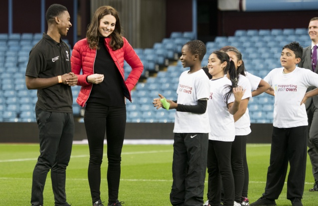 Catherine, que está grávida pela terceira vez, completou o look com sapatos em tons claros de Oscar de la Renta e clutch dourada.
